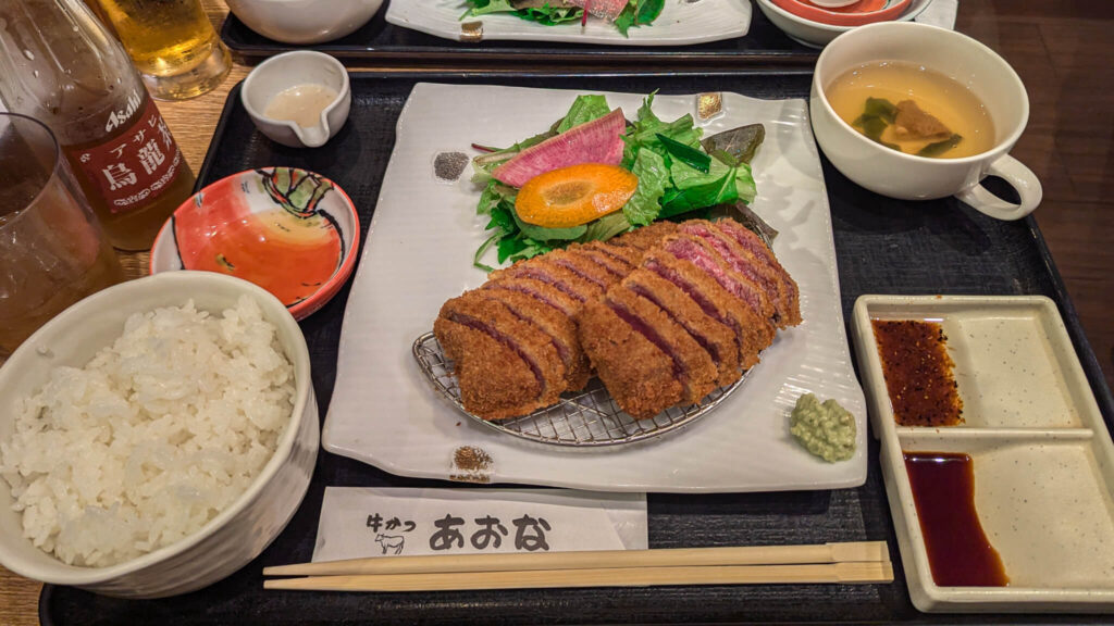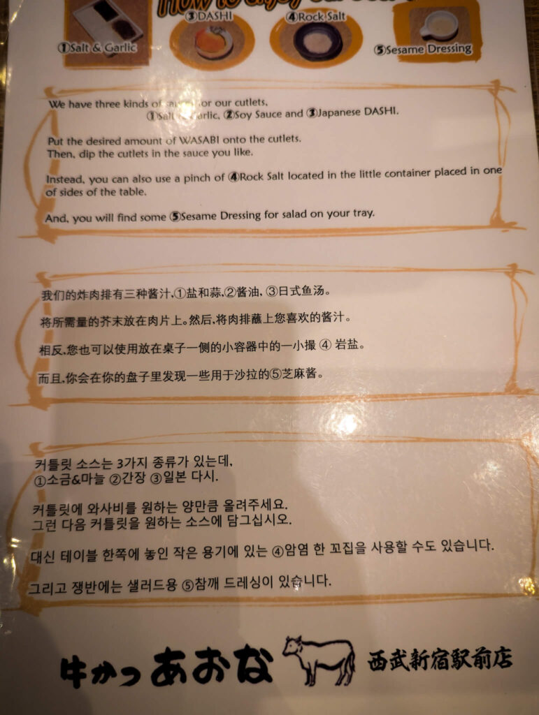 19:00 – 20:00:晚餐時間,去了新宿 牛かつ – 黑毛和牛150g ¥2670,說實話他們的和牛不太特別,但各種醬汁的搭配,讓一個和牛也有不同的風味可以品嚐!